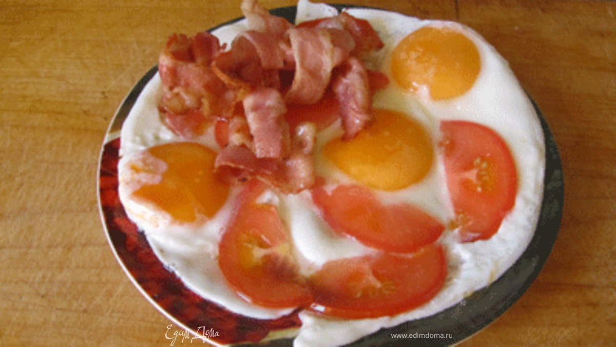 Жарить до готовности на медленном огне. Выложить на тарелку ,сверху выложить бекон. подать на стол. Все готово! Приятного аппетита!