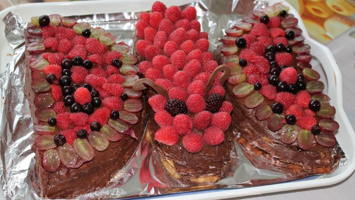 - Шаг 17Бисквит аккуратно разрезать пополам Разложите их по бокам заварного батона, срезом ни изнанку, как крылья бабочки.Смажьте срезу оставшимся шоколадным кремом. Украсить ягодами . Проделать ножом отверстия для рожек и аккуратно вставить шоколадные рожки в дырочки.