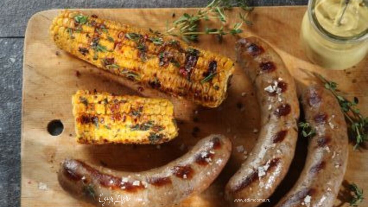 Уложите колбаски на разогретую решетку, через 5 минут выложите кукурузу и жарьте все вместе, не забывая переворачивать, 5–7 минут.
