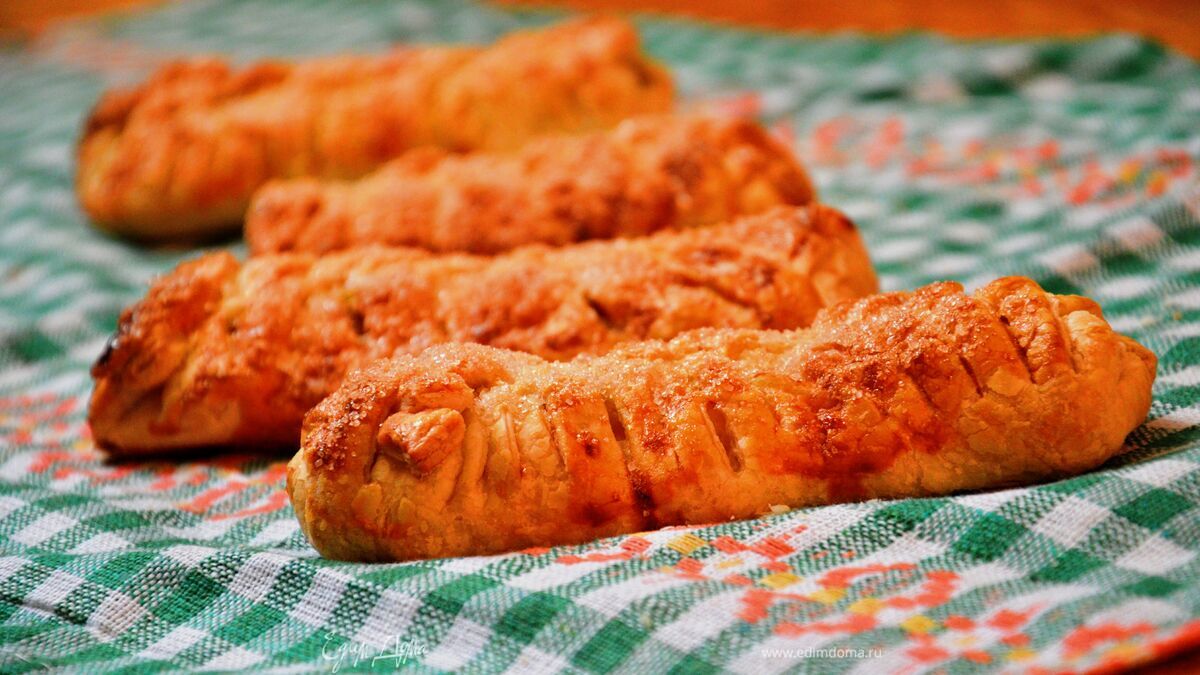 Выложить слойки на противень застеленный пергаментом,смазать слойки взбитым яйцом и обильно присыпать сахаром. - Шаг 5