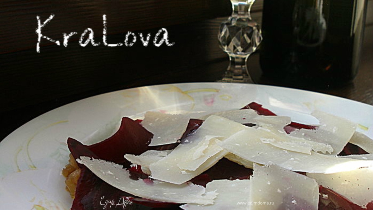 - Подготовка1. Лук измельчить и поджарить на сливочном масле до мягкости. 2. Добавить сахар, соль и уксус. Готовить еще в течение 3-4 мин. 3. Влить вино и готовить еще 2-3 мин. 4. Можно с помощью блендера превратить луковую смесь в пюре, но это не обязательно. Выложить луковую массу на тарелку. 5. Сверху выложить свеклу, нарезанный тонкими пластинами, сбрызнуть маслом. Выложить сверху пармезан.