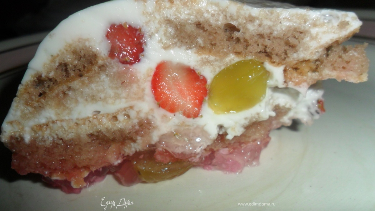 - Шаг 2Потом в посуду где будет находится желе покрываем пищевой плёнкой выкладываем бисквит и фрукты слоями и заливаем сметано-желатиновой смесью. Можно сверху взять и залить разноцветным желе. Только воды нужно меньше чем написано на упаковки.