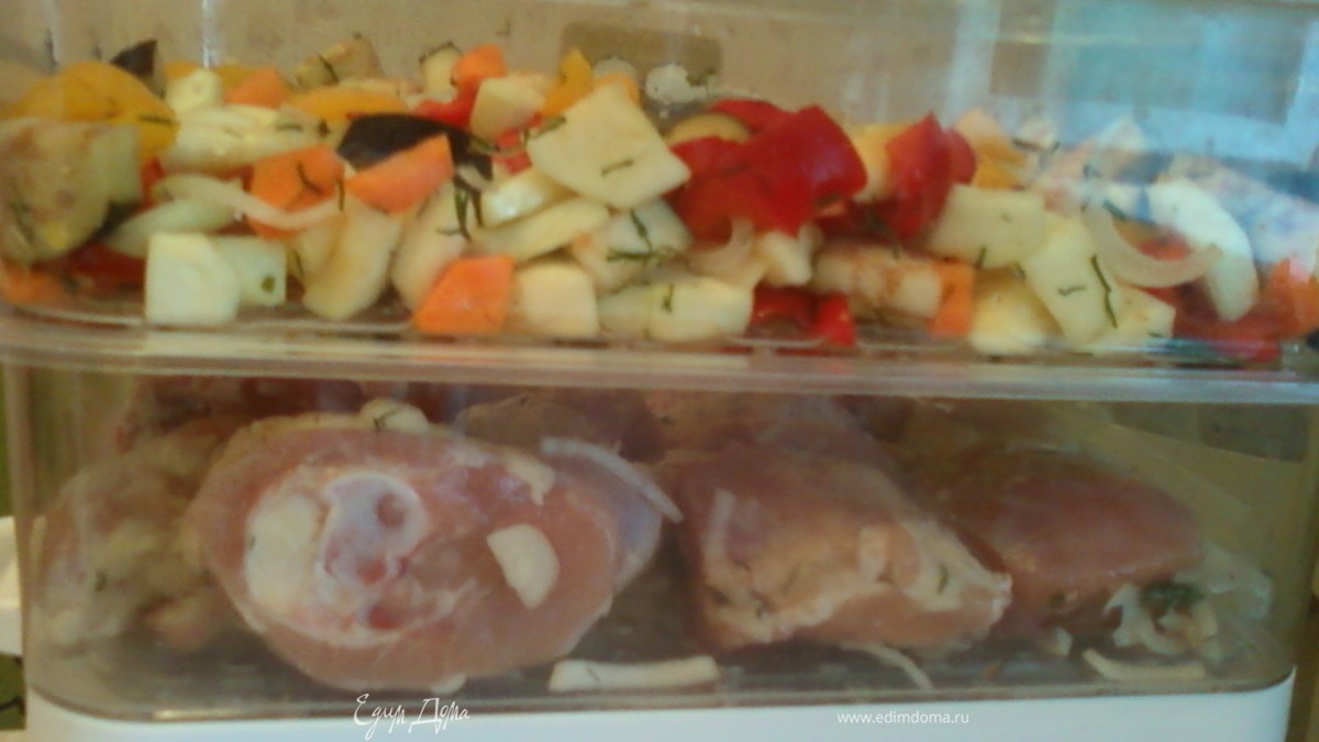 Окорочка разрубить на небольшие куски + соль, перец, зелень и дать постоять примерно 1 час. Отдельно порезать баклажаны и залить на 30 минут в холодной, соленой воде. Порезать болгарский перец, лук репчатый, морковь, кабачок. Добавить баклажаны,все посолить и тоже дать постоять. Затем окорочка выложить на нижний поддон.