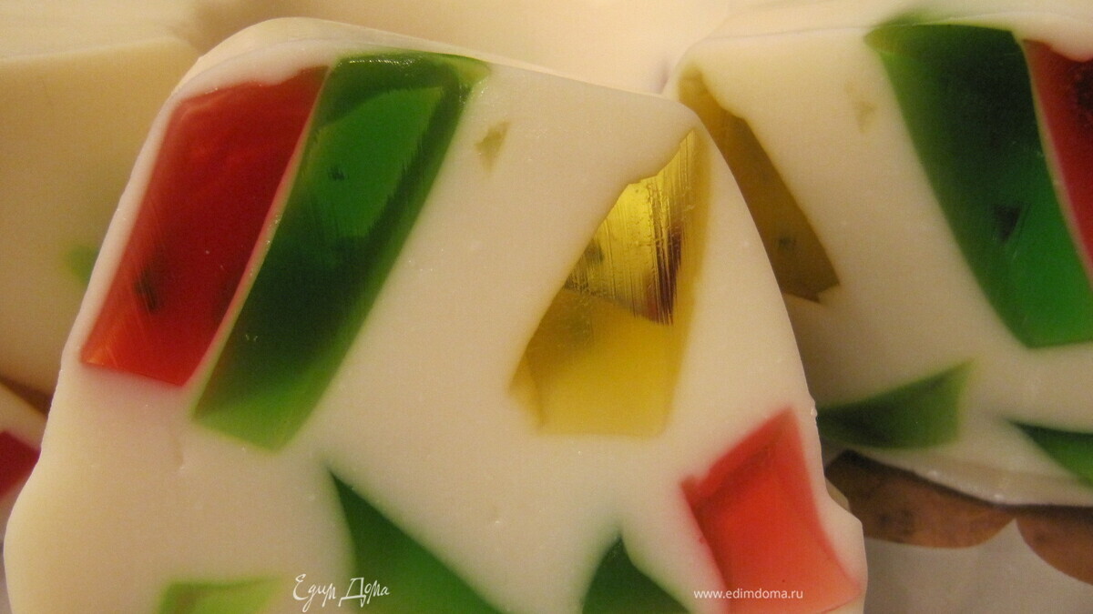 - Шаг 12-3 пакетика желе разного цвета развести в воде, в половину меньшем количестве воды, чем написано в инструкции, чтобы было тугое, держать в холодильнике ночь. 30 г быстрорастворимого желатина развести на водяной бане в 250 г воды, добавить 1,5 стакана сахара (300 г), 1 пакетик ванильного сахара, варить до однородной массы, затем влить в 1 л сметаны. Охладить, смешать с нарезанным цветным желе. Влить в форму, поставить в холодильник на 2 часа и более.