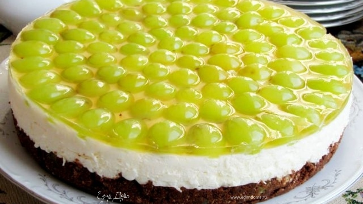 Изюм залить горячей водой и оставить на 30 минут. Затем отбросить на дуршлаг, промыть и обсушить. 25 мл желатина развести в 100 мл воды. Оставшийся желатин развести в виноградном соке. Печенье измельчить в крошку. Темный шоколад растопить на водяной бане. Добавить в шоколад печенье и изюм, перемешать. Я еще добавила немного сливок, т.к. было суховато. Дно и бортики разъемной формы 22 см (у меня 26 см) выстлать пергаментом. Выложить шоколадную смесь, разровнять и поставить в холодильник. Белый шоколад натереть на крупной терке. Сметану взбить с сахаром. Добавить натертый шоколад и разведенный в воде желатин. Перемешать. Сливки взбить в плотную пену. Аккуратно ввести в сметанную смесь. Выложить в форму на шоколадную подложку, разровнять поверхность и вернуть в холодильник, как минимум на 1,5 часа. Разведенный в соке желатин слегка подогреть, постоянно помешивая, затем дать остыть. Виноград вымыть, обсушить. Разрезать каждую ягоду пополам и удалить косточки ( у меня виноград без косточек). Уложить виноградины на поверхность торта. Хорошо смазать желатиновой смесью верх торта и поставить в холодильник до полного застывания, примерно на 3 часа.Приятного аппетита!