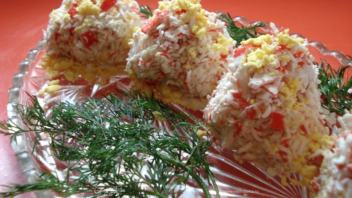 Смешиваем майонез и сметану. Соединяем сыр и яйца, заправляем смесью сметаны и майонеза, перемешиваем. Из этой массы формируем шарики и обваливаем их в крабовых палочках. Украшаем зеленью.