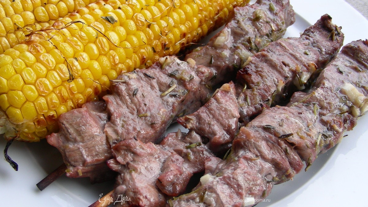 Теперь в оригинале. Кукурузу надо вымочить вместе с початками минут 15 в холодной воде, тогда они потом не пригорят. Затем отвернуть листы на три четверти вниз, удалить волосы и смазать каждый початок с помощью силиконовой кисточки. 1 ч.л. оливкового масла. В каждый початок воткнуть по несколько веточек трав и закрыть початок листом. Первый слой обертки удалить и им связать початки, чтобы не раскрывались. Выложить початки на решетку и готовить на среднем огне минут 30-40, время от времени переворачивая. Готовность проверяем ножом.