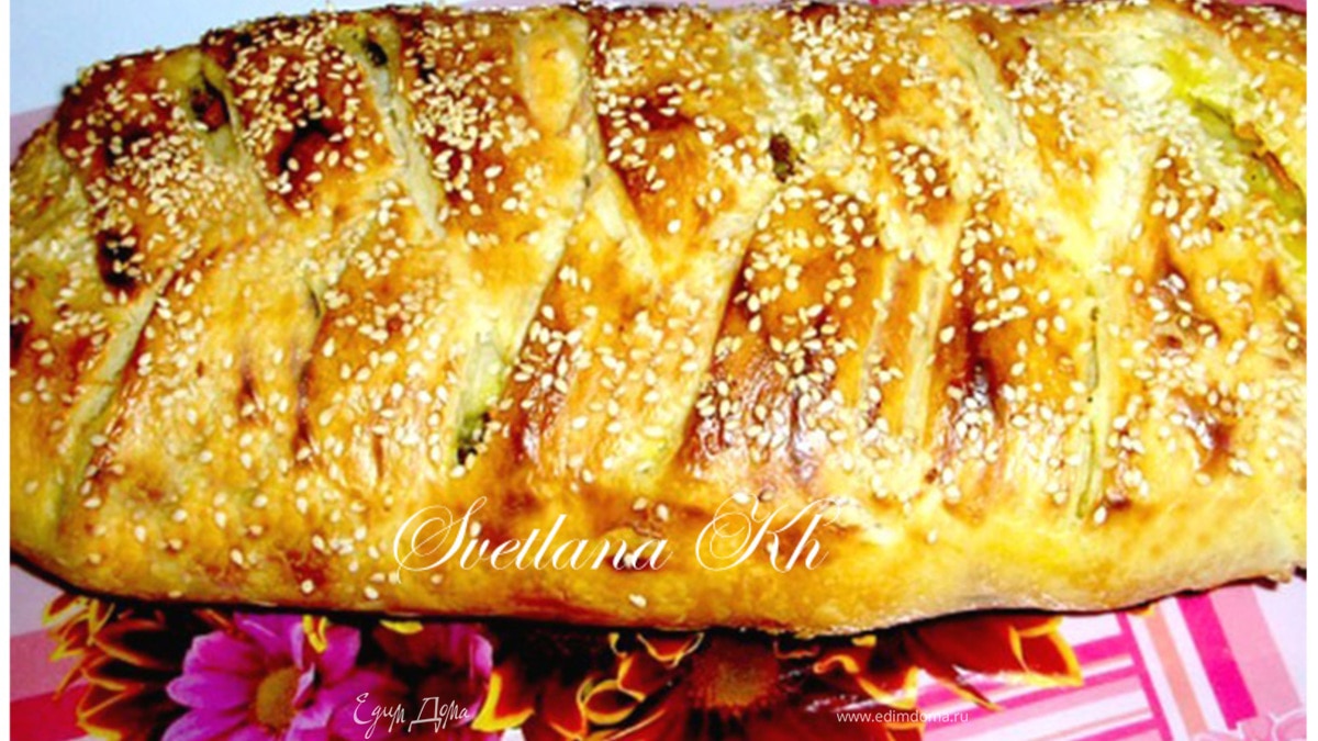Начинку уложить на тесто и заплести косичкой. Смазать яйцом и посыпать кунжутным семенем. Выпекать до золотистого цвета. - Шаг 5