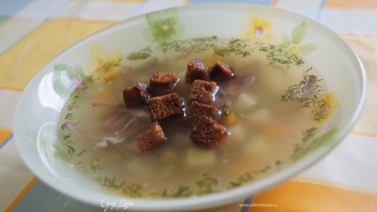 - Шаг 1В самом конце варки добавить зелень. Подавать горячим. Можно с сухариками или сметаной. Приятного аппетита!!!