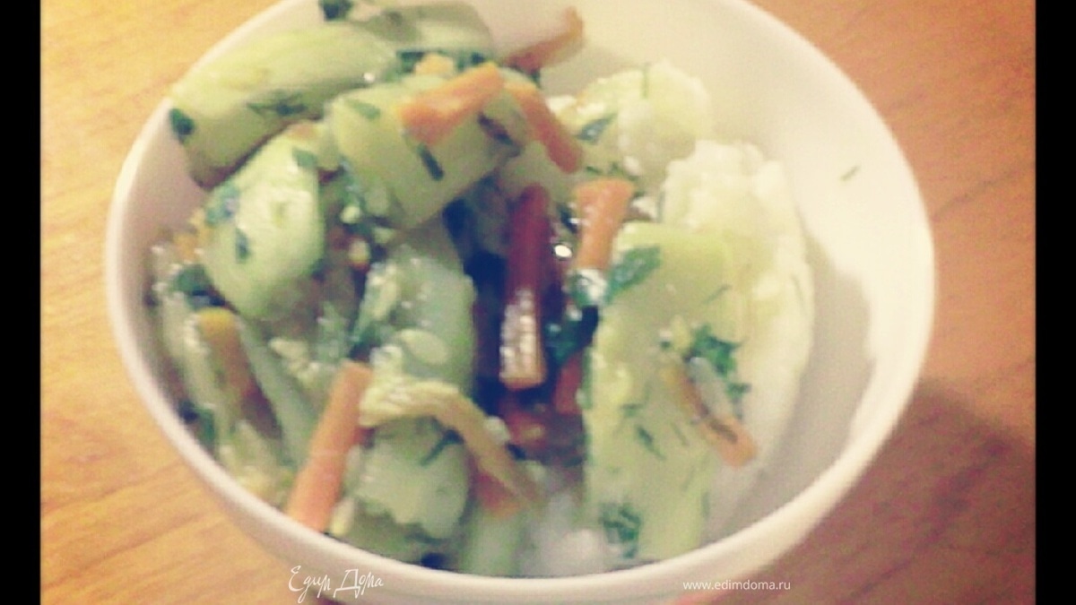 - Шаг 4В это время отвариваем рис согласно инструкции на упаковке. В конце приготовления кабачков снова посыпаем оставшейся частью зелени и перемешиваем. Подавать блюдо из кабачков с рисом) Просто, полезно и вкусно! Приятного аппетита! :)