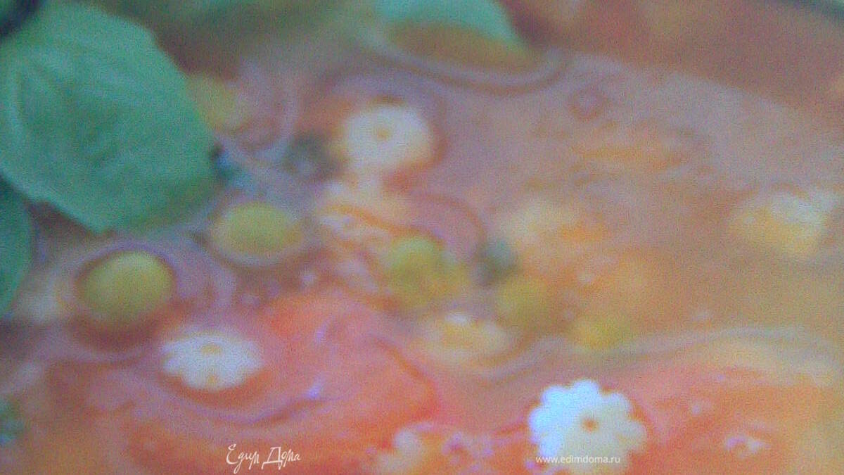 - Шаг 11. Лук и чеснок мелко нарезать.Обжарить на оливковом масле. 2. С помидор снять кожицу, мякоть измельчите в блендере. Добавить к луку и чесноку помидоры, кетчуп, овощной бульон и варите 10 мин на маленьком огне. 3. Макароны отварите. Базилик нарежьте. 4. К супу добавьте макароны, базилик, горошек, посолите, поперчите и варите до готовности. 5. При подаче суп украсьте базиликом
