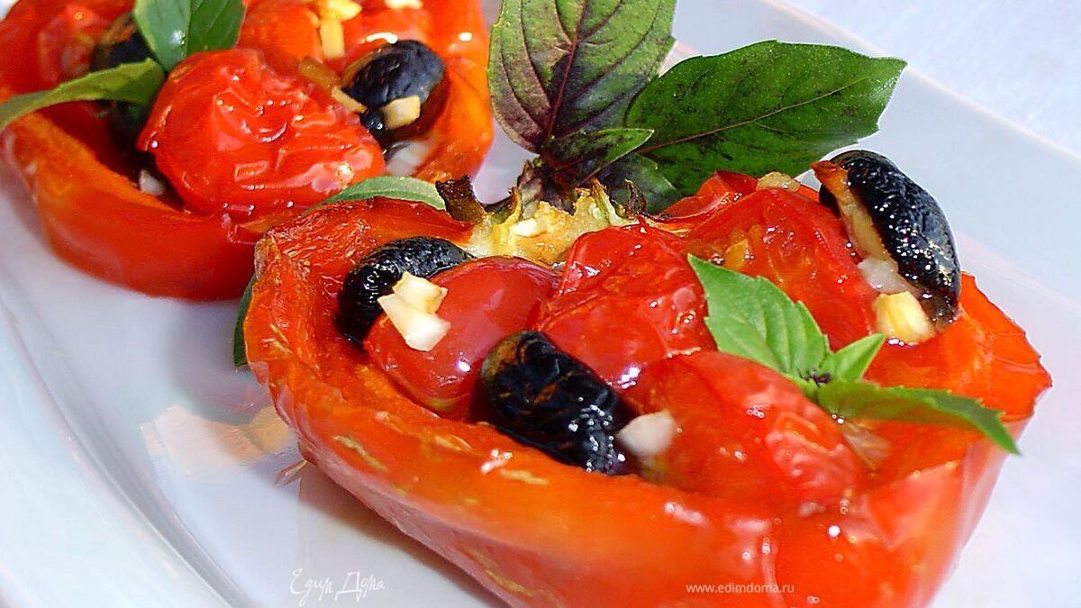 Перец выкладываем на противень, застеленный пергаментной бумагой и фаршируем его подготовленной овощной смесью. В каждую половинку перца добавляем по 1 десертной ложки оливкового масла. - Шаг 3