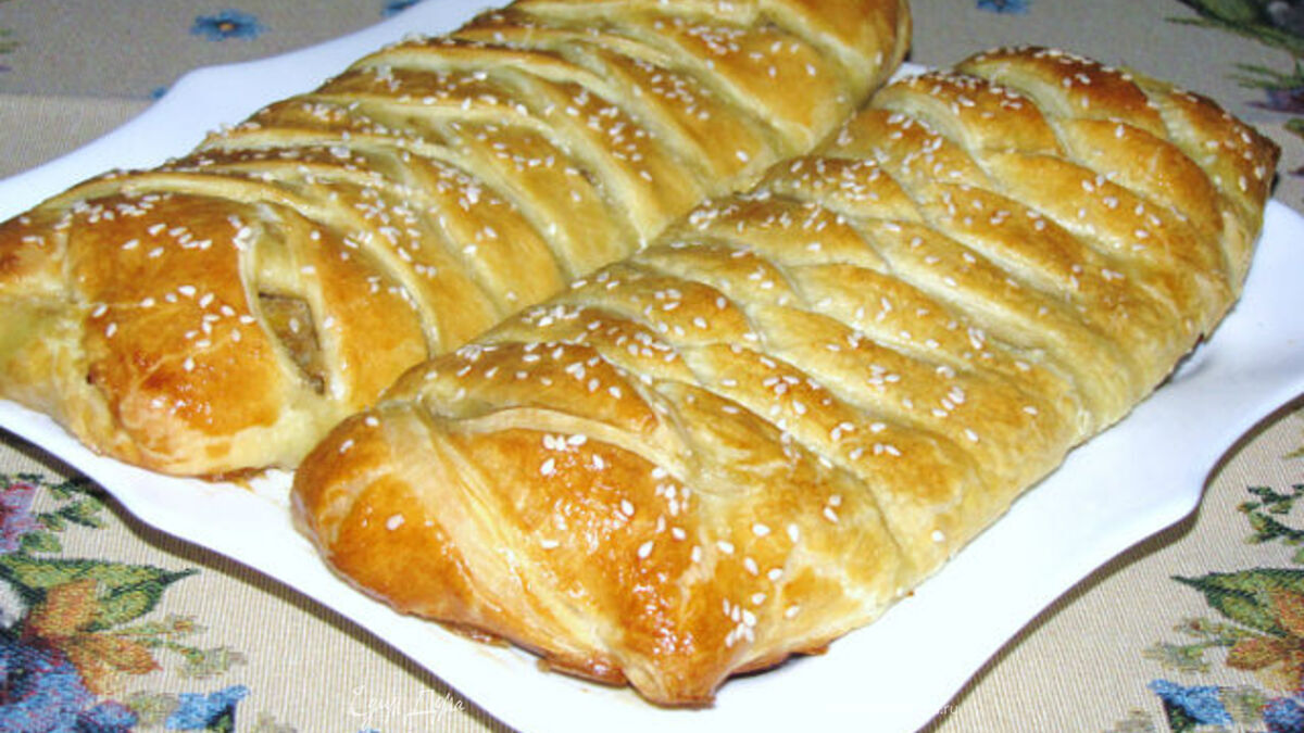 - Шаг 3Начинку выложить на пласт раскатанного теста, сформировать кулебяку, обмазать ее слегка взбитым яйцом, посыпать кунжутом .