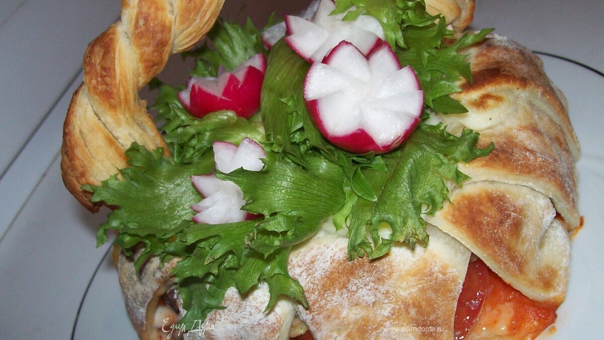 Вот наша запеканка готова, а теперь начинается самое интересное.))..превращение запеканки в корзину с цветами. Для начала ставим ручку. Что бы прикрепить к корзинке ручку, в основание ручки вставьте несколько зубочисток с кажной стороны и прикрепите ручку к корзинке. Для украшения я взяла листья салата "Фриллис" и редис из которого вырезала цветочки. Редис до украшения должен находится в ледяной воде, тогда он будет очень вкусным и хрустящим. - Шаг 10
