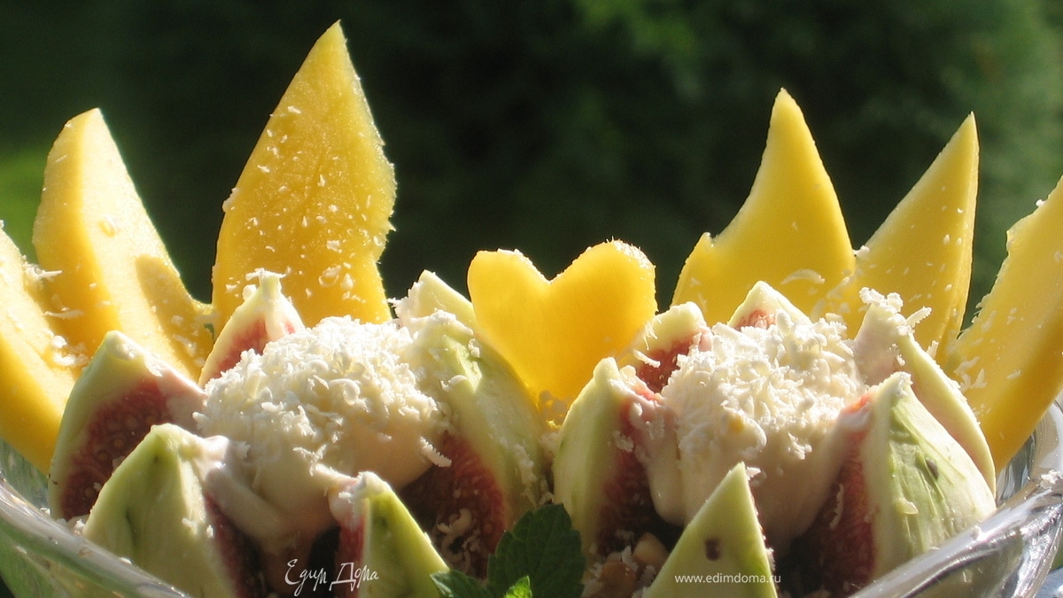 Фрукты здесь могут быть разные. Мне понравилось сочетание инжира и манго. Подготовить фрукты: инжир очистить от кожуры и каждый надрезать на 6 долек; манго очистить и нарезать тонкими пластинками - Шаг 1