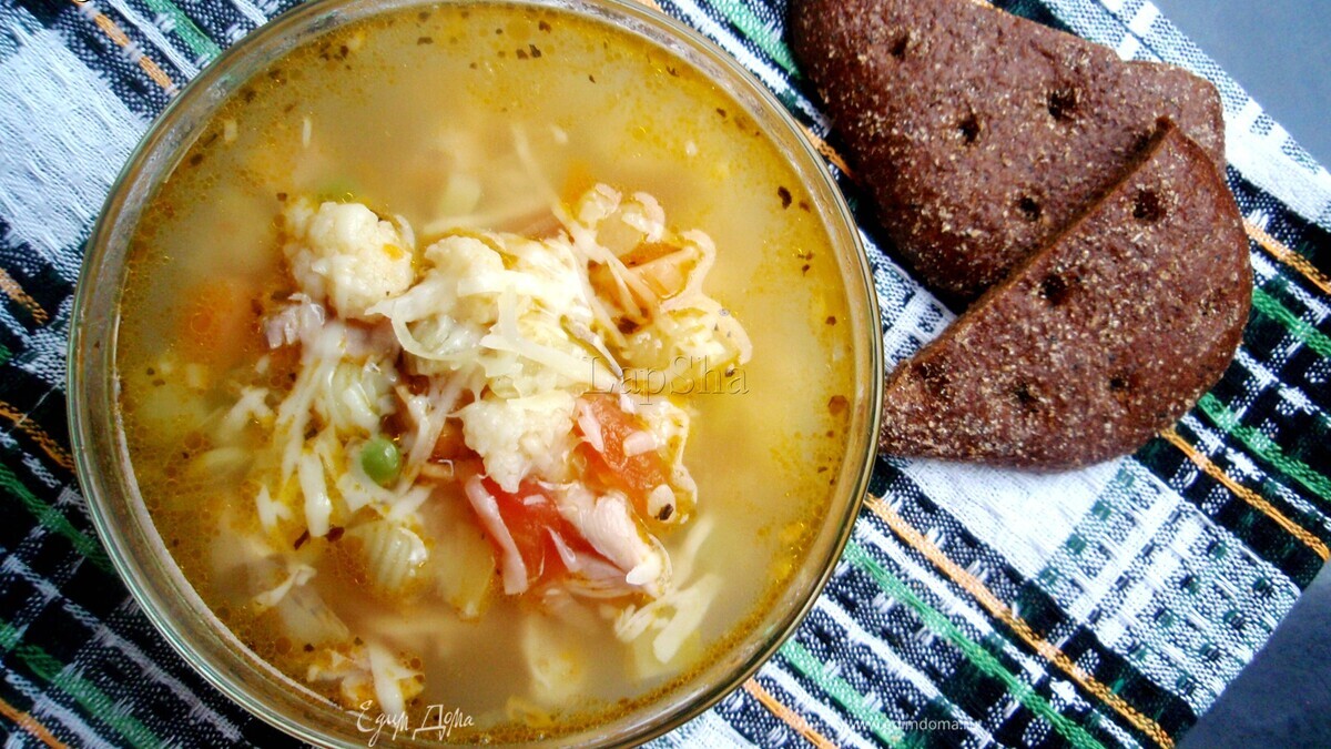Когда цветная капуста и кабачок будут практически готовы, добавляем зеленый горошек и пасту. Варим все вместе 10-15 минут. Супу надо дать хотя бы пол часа, чтобы он настоялся и можно подавать к столу приправив натертым сыром.