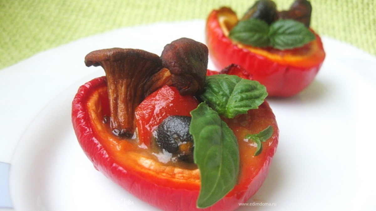 Перец посолить. Для начинки нарезать мелко помидоры, оливки - кольцами, добавить яблочный майонез, посолить и поперчить по вкусу, добавить мелко нарезанный чеснок. Начинить перцы помидорным салатом. - Шаг 3Выпекать в разогретой до 200оС духовке около 30 минут. Следите за ними, перцы должны пустить сок и стать мягкими, но не настолько, чтобы расползтись у вас по противню. Украсить жареными лисичками и листками базилика. Подавать можно как теплыми так и холодными. Приятного аппетита!