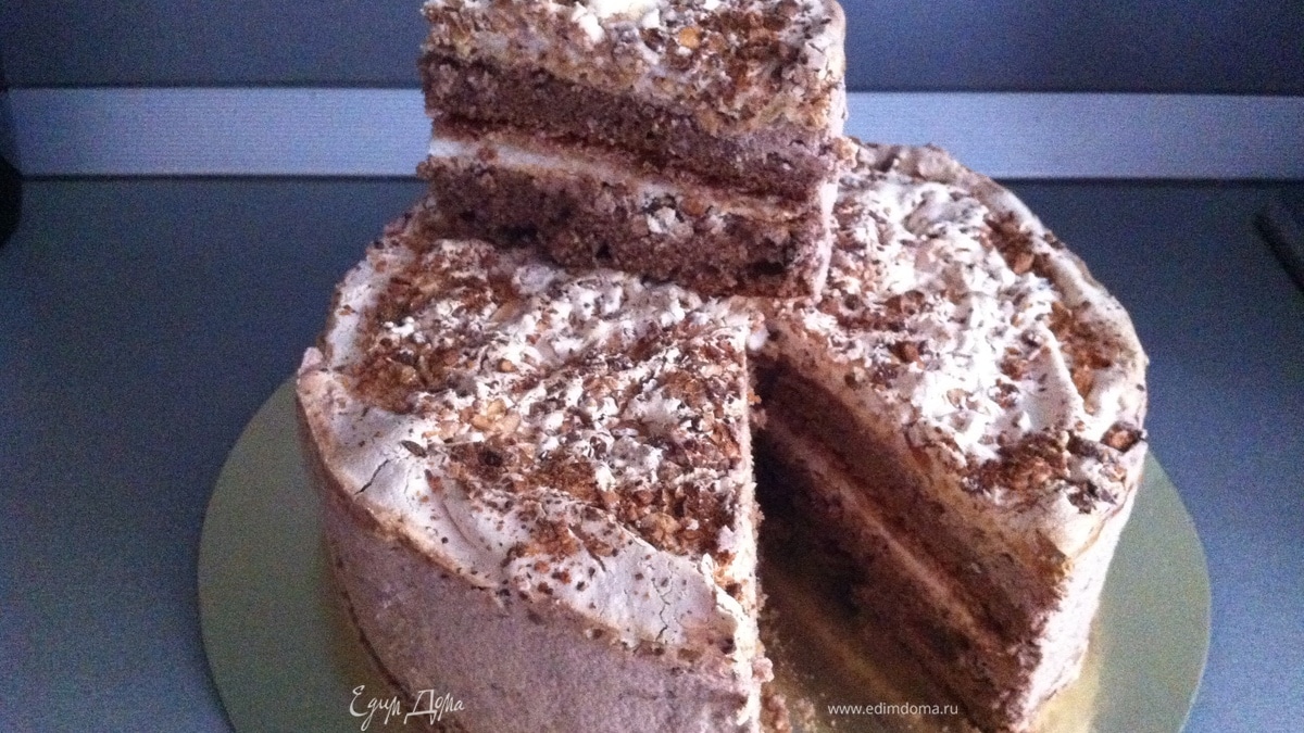 Собираем: первый корж бисквитный пропитать сиропом( я делала карамельный, можно любой) сверху смазать кремом.Сверху накрыть безовым коржом орехами в низ.Намазать кремом.Если оставлять все безовые коржи то опять сверху корж орехами в низ и крем.Я убрала. поэтому положила на второй корж бисквитный.пропитала, смазала кремом.А верхний корж безовый кладется орехами вверх.Если остался крем,можно обмазать бока, а сверху залить шоколадной глазурью.Я не заливала-он и так вкусный:-) Приятного аппетита!!!