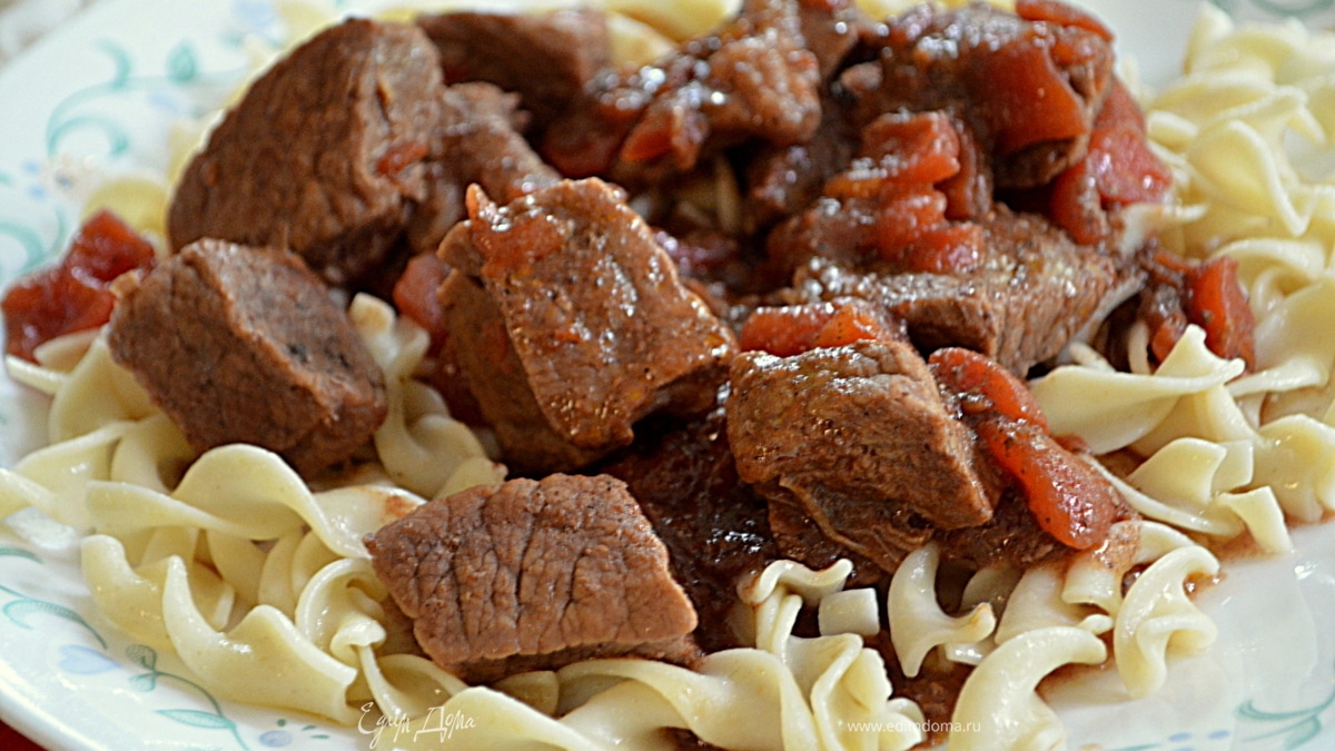 Пока готовится говядина, примерно до окончания времени сварим по инструкции яичную лапшу, добавим в готовое блюдо 1 1/2 ст.л. масло, перемешаем, посолим и поперчим. Выложим поверх яичной лапши готовую говядину и по желанию посыплем свеж.петрушкой. Приятного аппетита!