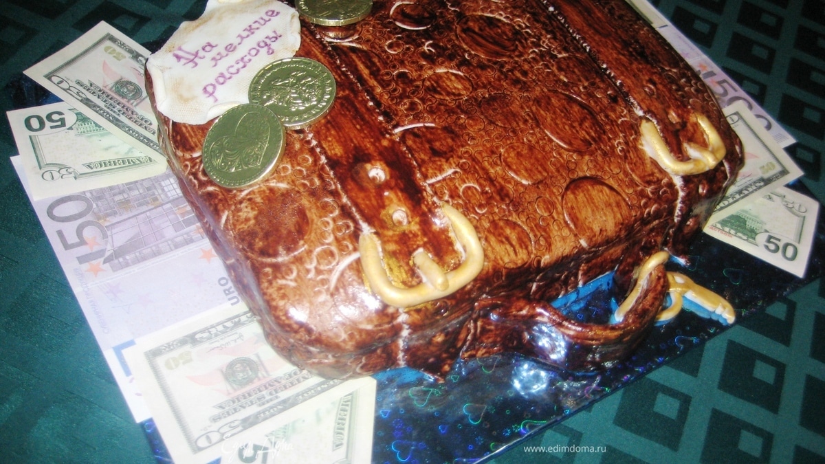 Обтянуть бисквит мастикой,предварительно сделав на ней отпечатки овалов,разного диаметра(я использовала колпачки от фломастера,соломку) Сделать ремни и застёжки с ручкой.Покрасить в коричневый цвет.Замки я покрыла красителем "Золото".Приятного аппетита!