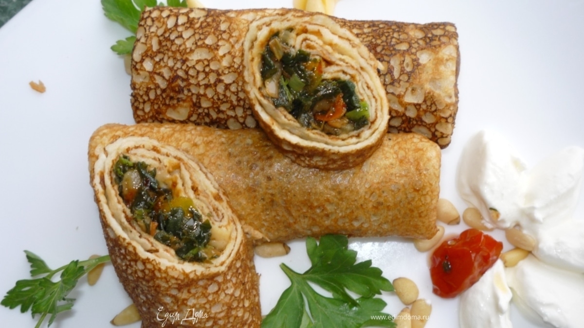 - Шаг 1Приготовить жидкое тесто и выпекать тонкие блины. Приготовить начинку: на разогретую сковороду влить немного оливкового масла, обжарить мелко порезанные лук и болгарский перец. Когда лук и перец поджарятся добавляем резанный шпинат, вяленые помидоры черри, все сбрызнуть лимонным соком (совсем чуть-чуть) Как только влага испарится посыпать зеленью. Приготовленную начинку завернуть в блин и подавать со сметаной Я иногда в начинку добавляю кедровые орешки.