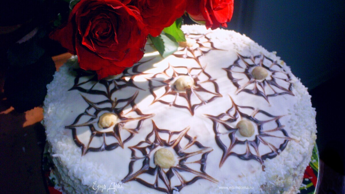 Бока торта обсыпаем смесью измельченных обрезков и кокосовой стружки. Шоколад растапливаем с 1 чайной ложкой сметаны, наполняем корнетик и рисуем по два концентрических круга. Затем зубочисткой делаем паутинку., в центр каждой кладем по орешку. Отправляем торт в холодильник, желательно на ночь. Приятного аппетита!