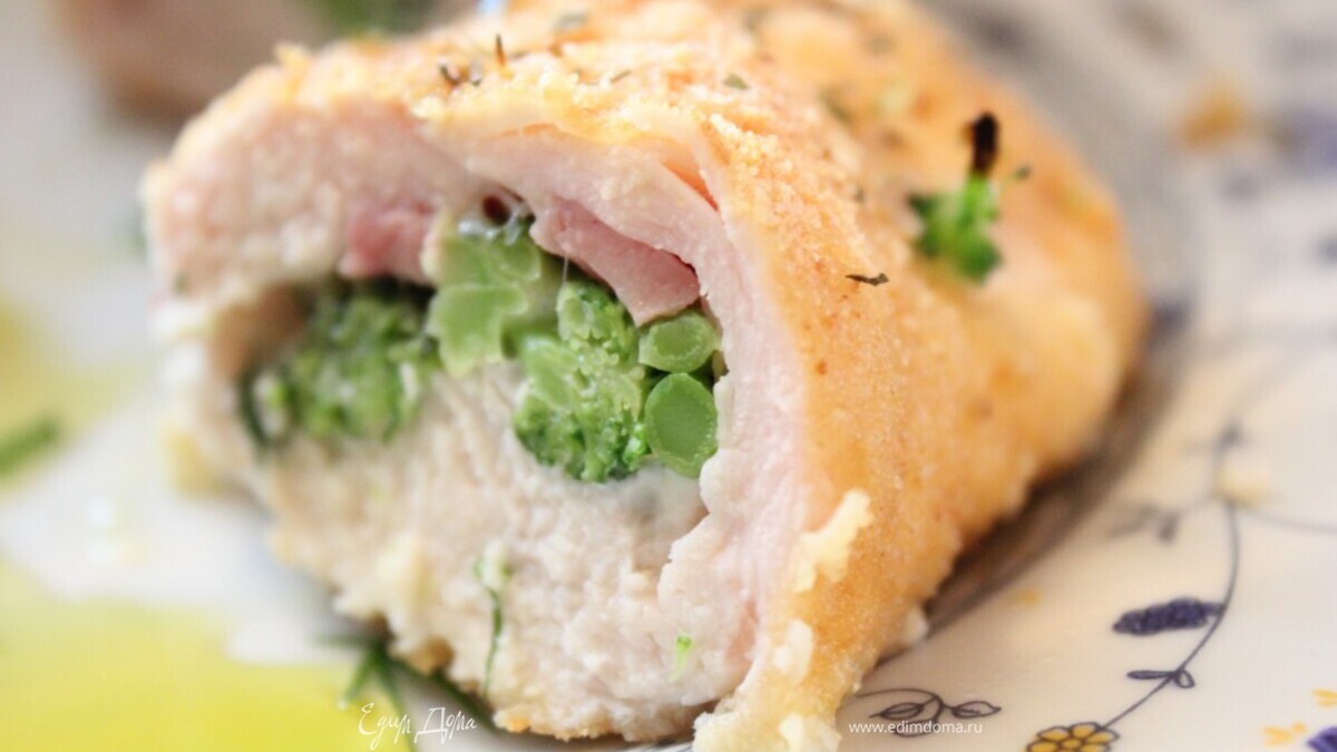 - Шаг 2Выкладываем на каждый кусок филе ветчину, порезанную ломтиками, кусочек моцарелы, брокколи и заворачиваем в рулет. Каждый рулетик обмокнуть в яйце затем в сухарях и запекать около 30 мин. Всем приятного аппетита!