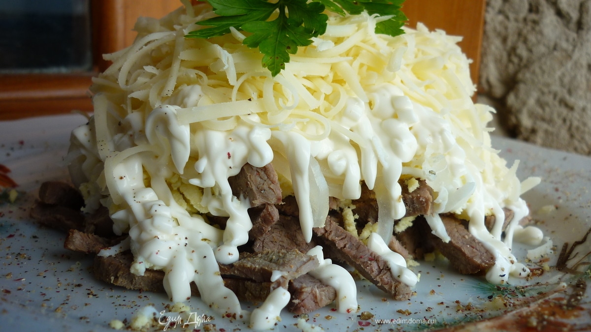 - Шаг 1Салат укладывать слоями:телятина (поперчить) - яйца-лук-майонез (слой не очень толстый) - сыр. Украсить зеленью.