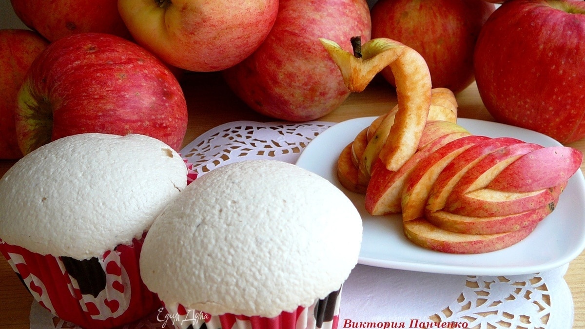 Яблоки также взбить, пюре должно стать светлее и немного увеличиться в объеме. Соединить белки, яблочное пюре и сахар. Перемешать и взбивать до тех пор, пока масса не перестанет растекаться. - Шаг 5