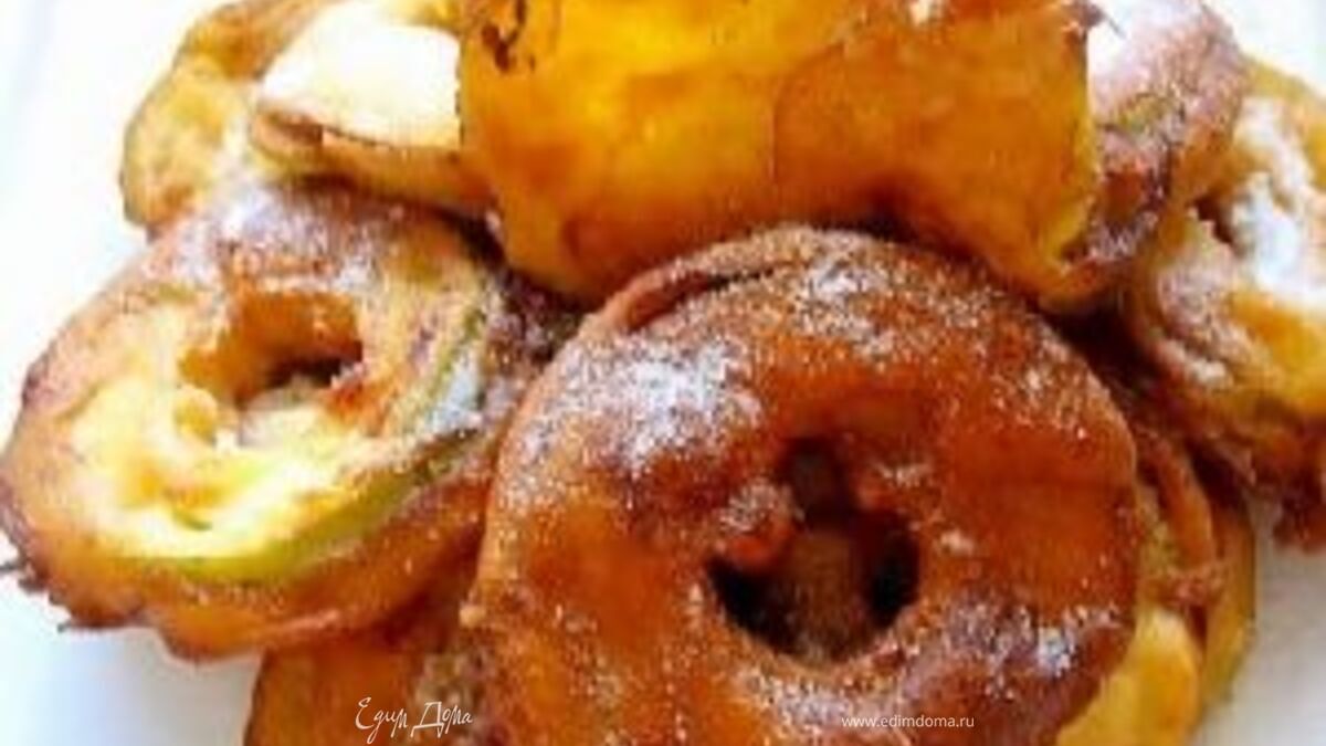 Колечки в тесте обжариваю на растительном масле до золотистости, как пончики. - Шаг 3Подаю к яблокам сливочный соус. Для его приготовления нагреваю сливки, добавив сахарную пудру, немного ванилина и корицы, и довожу до кипения.