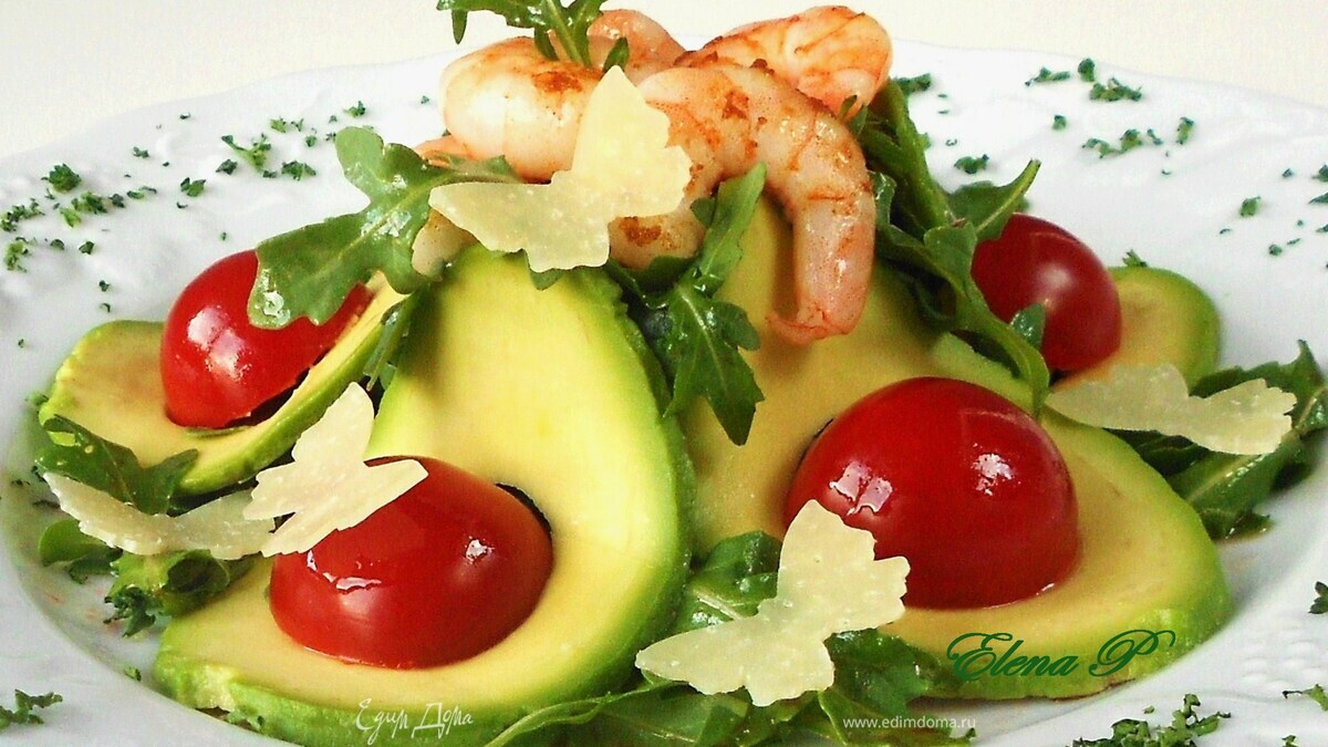 - Шаг 3Вокруг рукколы уложить пластины авокадо, закрывая отверстия в них половинками черри. Сверху разместить по 5-6 креветок. Фигурки из пармезана расположить произвольно. Можно приправить свежемолотым перцем. Соль я не добавляю. Мне достаточно пармезана.