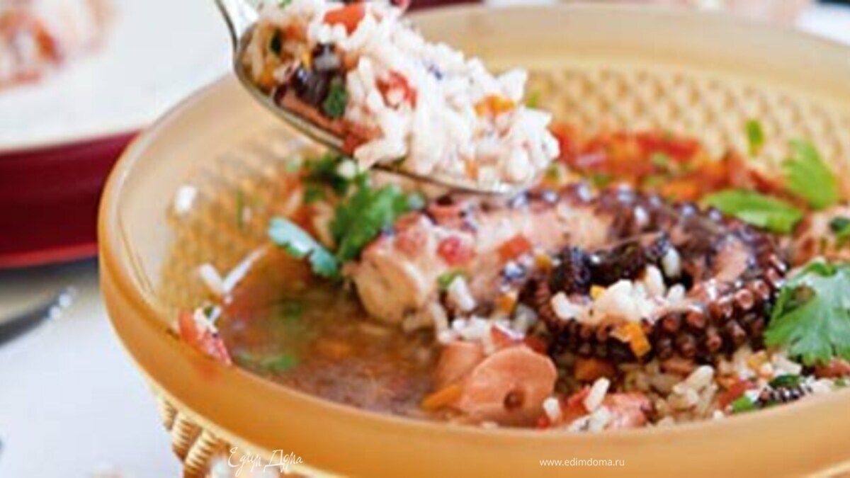Добавляем 800 мл. бульона,доводим до кипения,добавляем рис и осьминога,варим на медленном огне под закрытой крышкой,иногда помешивая,20-25мин. - Шаг 4