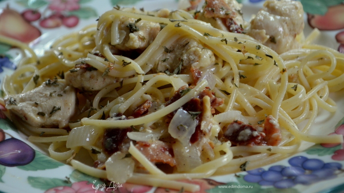 Когда паста готова,воду слить.Смешаем пасту хорошенько с курин.кусочками в большой чаше.Разделим на 4 порции и подаем к столу с петрушкой свежей по желанию.