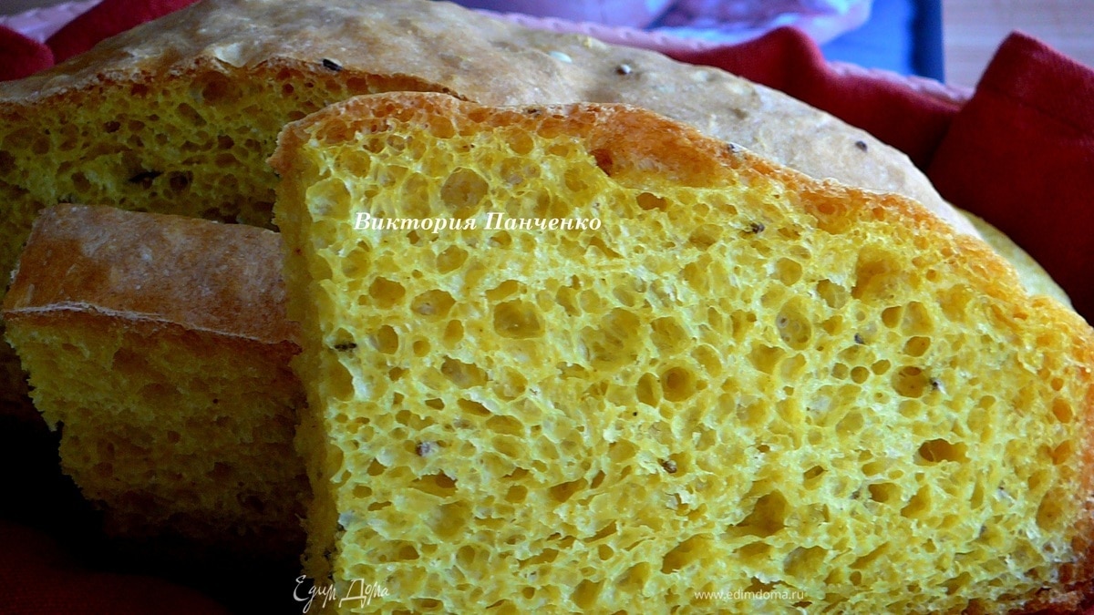 В последнюю очередь добавить куркуму и тмин. Вытащить тесто из чаши, переложить на присыпанную мукой поверхность и сложить в шар. Переложить шар из теста обратно в миску, накрыть полотенцем и поставить в теплое место на 1 час. Через час тесто увеличится вдвое... Выложить в форму (я делала в круглой) и оставить на расстойку на 30-40 минут. Духовку предварительно разогреть до 250 градусов. Открыть духовку, обрызгать стенки водой и быстро посадить хлеб. Дверцу закрыть и выпекать 25-30 минут до румяной корочки.