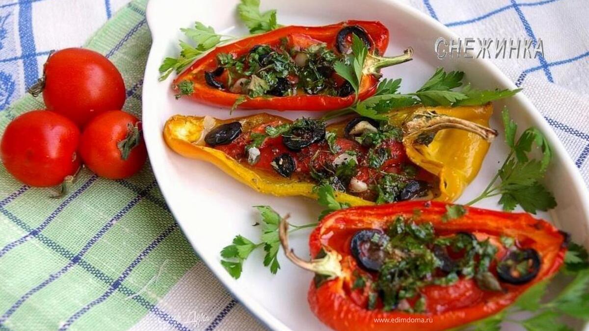 Запеченные перцы – полезное и легкое блюдо. В сочетании с томатами, маслинами, каперсами и зеленью они приобретают необыкновенный аромат и вкус! Сочные, мясистые, яркие перчики станут украшением Вашего стола! Перцы лучше брать удлиненные, можно разных цветов, так будет ярче и интереснее. В готовые перчики можно положить по ломтику овечьего сыра и подержать в духовке еще несколько минут до лёгкого его подрумянивания. Угощайтесь!