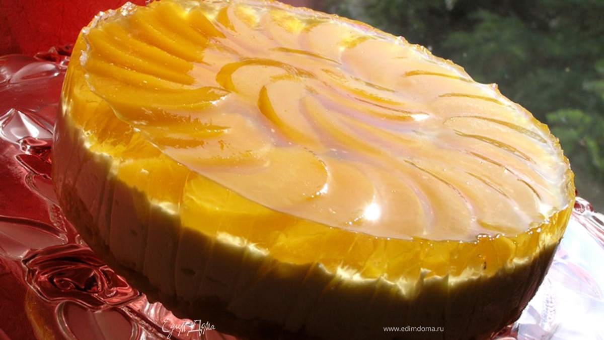 Приготовить персиковое желе. Желатин замочить в воде на 10 минут. Персиковый сироп нагреть, добавить отжатый желатин и лимонный сок, перемешать до растворения желатина.