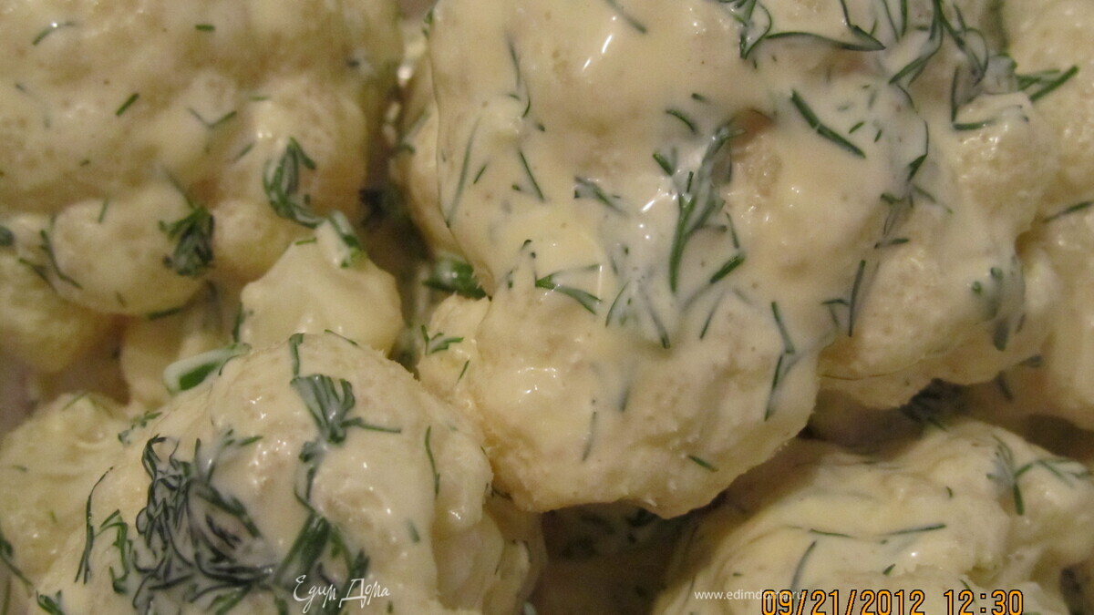- ПодготовкаЦветную капусту очищаем от листьев, моем и разбираем на мелкие соцветия. Заливаем горячей водой(капуста дожна быть покрыта водой), добавляем соль и оставляем под крышкой на 5-6 часов. Через 5-6 часов вынимаем капусту из воды и приступаем к приготовлению соуса. В миску кладём 100 грамм(можно больше или меньше)майонеза, добавляем измельчённый чеснок(я в ступке делаю) . Мелко нарезаем укроп и добавляем его к соусу. Перемешиваем соус и выкладываем его в миску с капустой. Хорошо перемешиваем салат. Оставляем салату настояться на 2-3 часа. Приятного аппетита!!!!!!