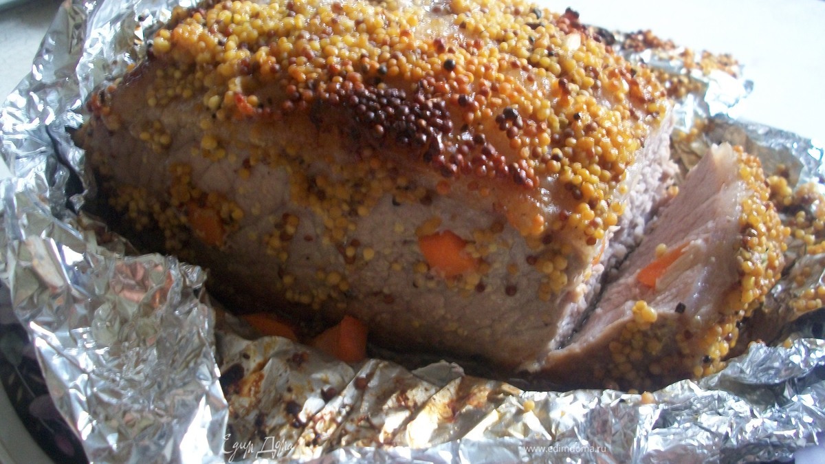 Мясо помыть, обсушить. Морковь и чеснок порезать небольшими брусочками. Нашпиговать мясо нарезанными морковью и чесноком. Посолить, поперчить и со всех сторон щедро обмазать французской горчицей. Аккуратно завернуть мясо в фольгу, я заворачиваю в два слоя (если фольга прорвется, то сок вытечет и мясо будет сухим), и отправить в духовку. Запекать минут 40-45 (зависит от того какой кусок), затем нужно фольгу сверху разрезать и открыть, запекать еще 5-10 минут, пока горчица не подрумянится. Дать мясу "отдохнуть" 10-15 мин. Приятного аппетита!