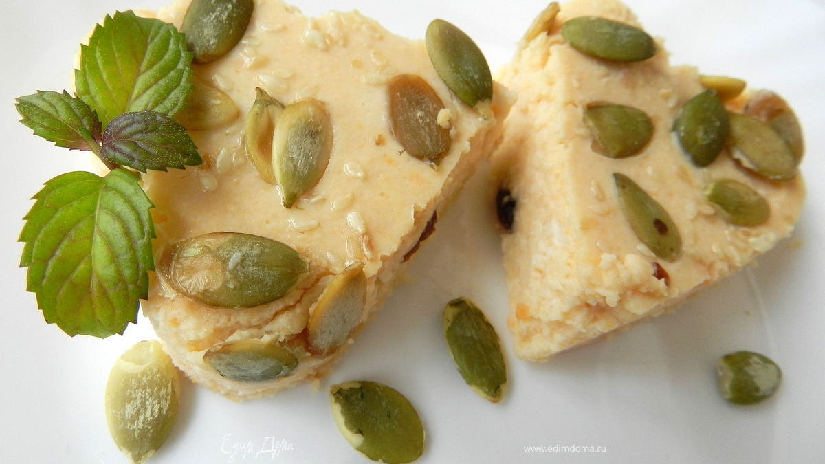 Творог размять с помощью блендера с яйцами, сахаром, измельченным яблоком и тыквенным пюре. Всыпать крахмал, тщательно перемешать, добавить вяленую клюкву (или вишню). Разложить массу по формам для выпечки. Посыпать тыквенными семечками и семенами кунжута. Духовку разогреть до 180 градусов, выпекать 30 мин. Остудить в форме.