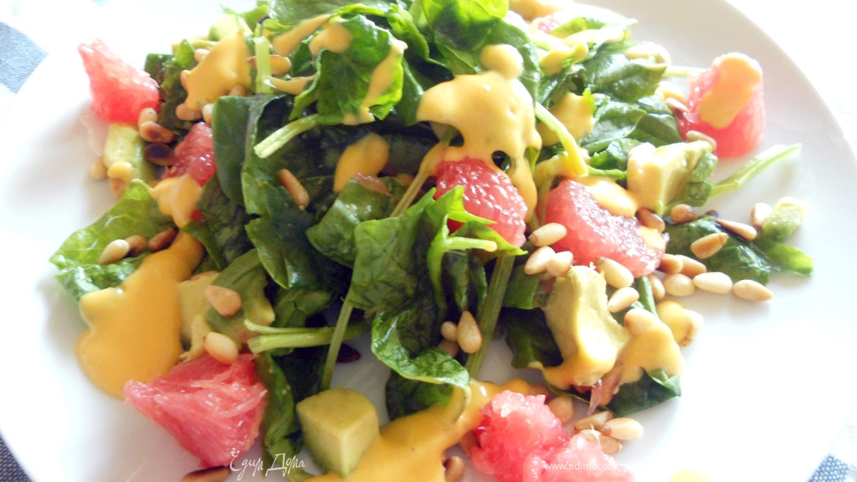 Салат со шпинатом, авокадо и грейпфрутом с дрессингом из папайи