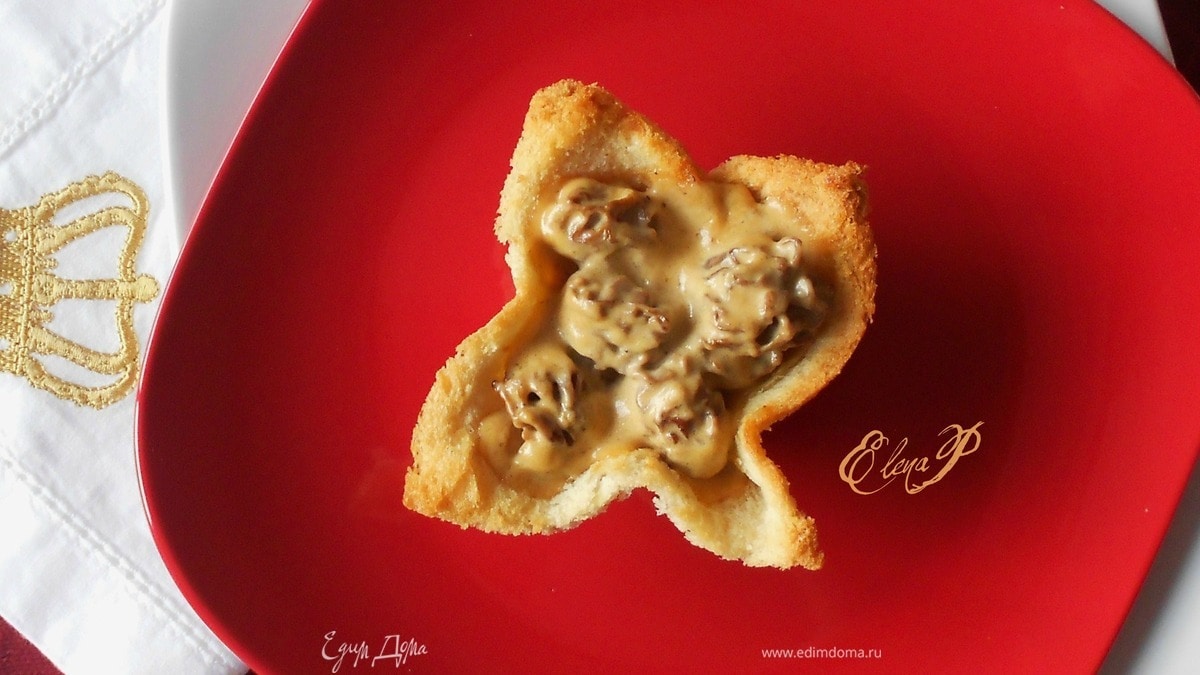 - Шаг 7В горячие тосты разложите грибы с соусом и немедленно подавайте.
