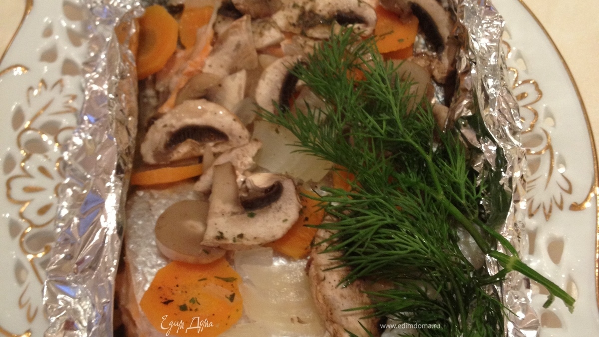 Форель с шампиньонами, луком и морковью, запеченная в фольге