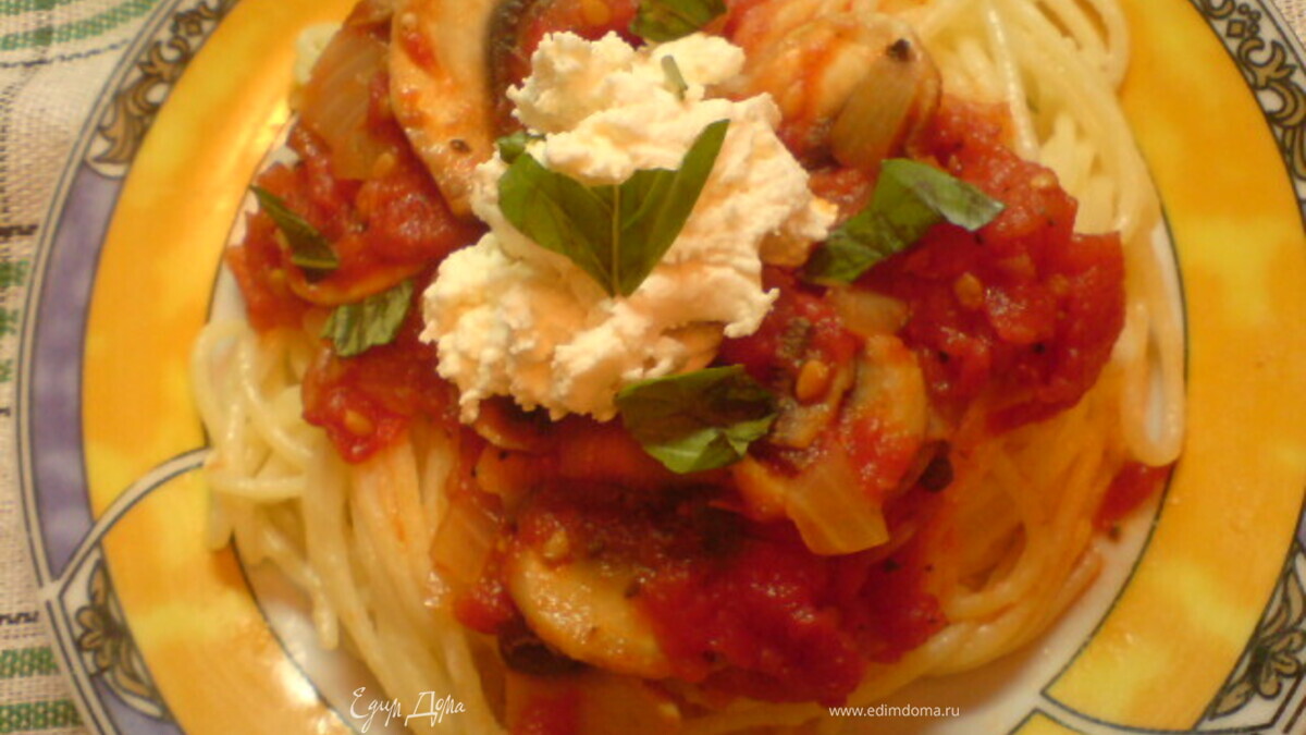 Соус я готовила сама. Вы можете приготовить соус так, как любите. Мне понравился такой рецепт: 400 г помидоров избавить от кожуры и мелко нарезать. Очистить и мелко изрубить 1 среднюю луковицу. В сковороде разогреть оливковое масло, отправить туда лук и 1 зубчик чеснока (я использовала чеснок целым) и обжарить до прозрачности, чеснок вынуть. Добавить помидоры и 1/2 ч.л. орегано. Тушить где-то 10 минут. Снять с огня, добавить соль, перец, немного сахара. Шампиньоны нарезать тонкими ломтиками. В сковороде разогреть 1 ст. л. оливкового масла, обжаривать в нем грибы где-то 4 минуты. Добавить соус. Помешивая, готовить еще 4 минуты. Снять с огня. Если надо, добавить еще перца. Сварить макароны в подсоленной воде, воду слить. Если соус густоват, добавить немного воды, в которой варились макароны. - Шаг 2