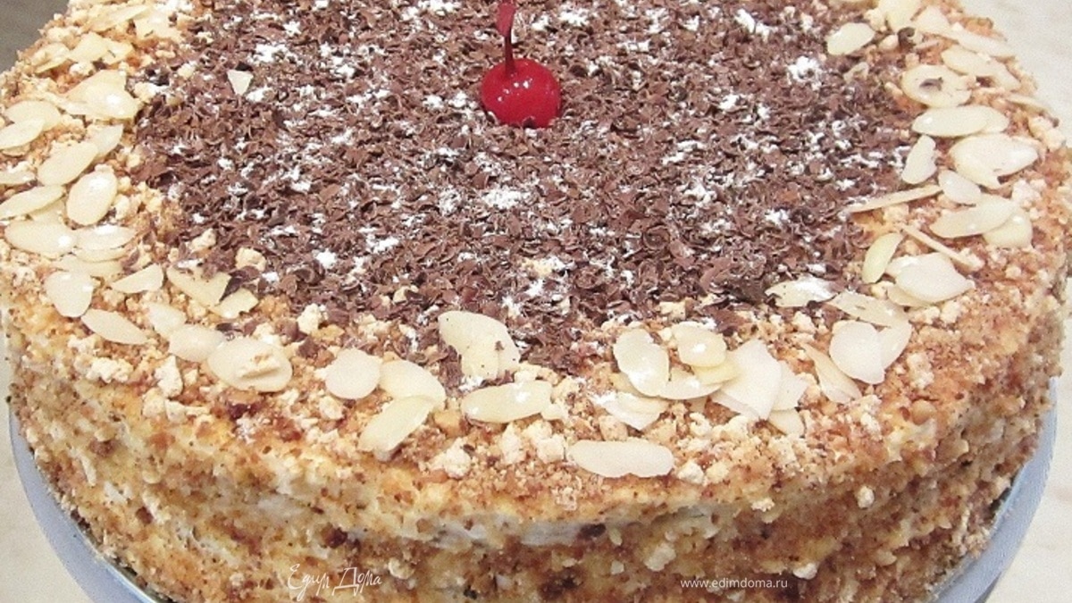 - Шаг 7Торт выдерживают в холодильнике 6-7 часов, чтобы он пропитался кремом. Верх можно оформить сахарной пудрой и тертым шоколадом. Приятного чаепития!!!