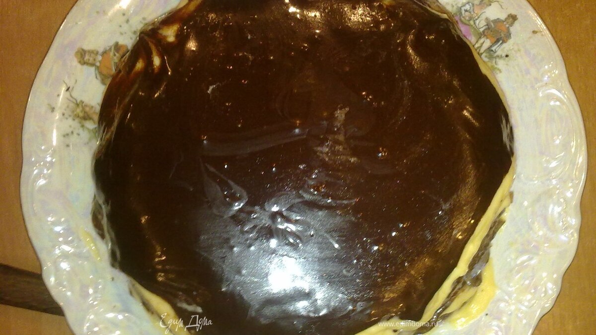- Шаг 2готовый корж разрезать пополам. половиной крема смазать середину, половиной - верх торта. полить глазурью. приятного аппетита!
