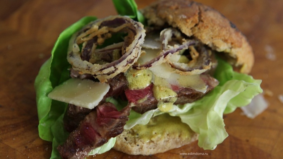 Ржаные булки разрезать пополам вдоль, смазать одну половинку горчичной заправкой, выложить салатный лист, затем кусочки мяса, сверху еще немного смазать заправкой, добавить хлопья пармезана, луковые кольца и накрыть верхней половинкой булки.