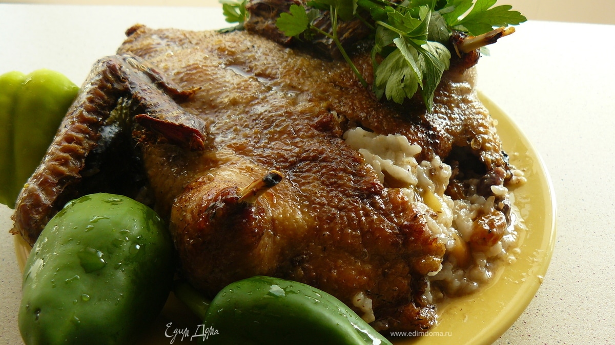 Утка по-домашнему, запеченная с рисом, фруктами и потрохами. Готовим с "HomeQueen Corporation"