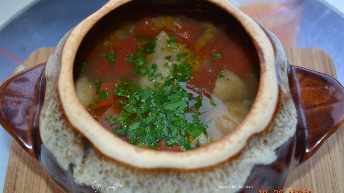 Помидор тоже режим средним кубиком и выкладываем на грибы. Бульон в котором варилась свинина доводим до вкуса и выливаем в горшочки. У меня получилось 4 горшочка. Накрываем крышечками и ставим в духовку при 180 градусах. Готовим 40 минут с момента закипания. После закипания приоткрыть немножко крышечки. При подаче посыпать зеленью.