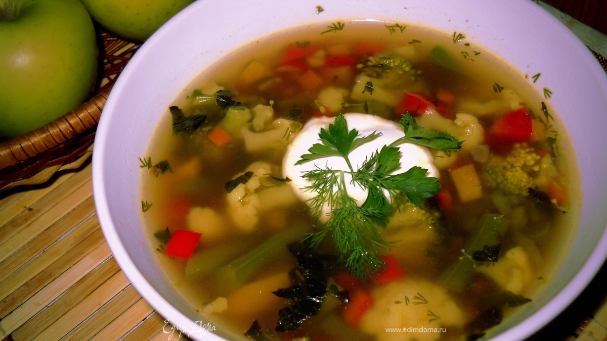 - Шаг 2Добавьте цветную капусту и брокколи, и залейте водой (кол-во можно регулировать в зависимости от желаемой консистенции). Добавьте специи и зелень, тушите на протяжении 10 минут, периодически помешивая.