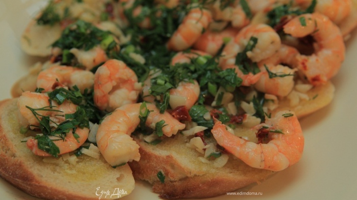 Креветки на чесночных гренках